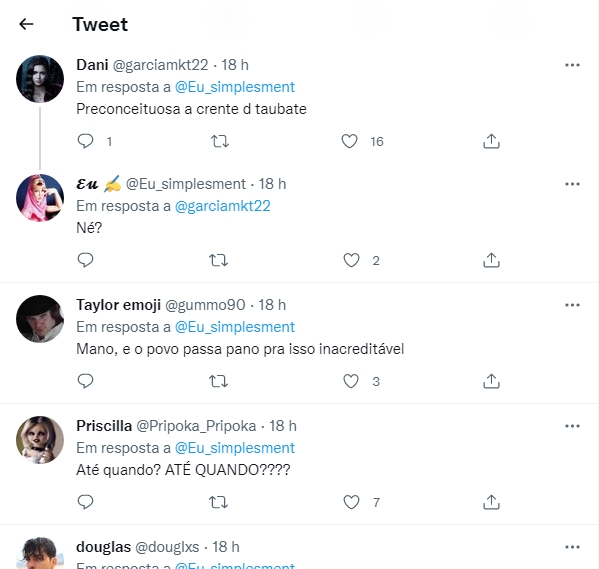 Sendo assim, não faltaram comentários dos internautas revoltados com a situação: “Preconceituosa, a crente de Taubaté”, escreveu um. Outro também disse: “Mano, o povo passa pano pra isso, inacreditável”, “A intolerância religiosa da dissimulada”. ” Até quando? Até quando?”, esses foram alguns comentários dos internautas.