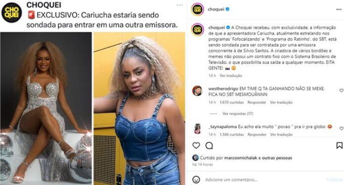 De acordo com informações da página de fofocas ‘Choquei’, a artista estaria sendo sondada para entrar em uma outra emissora. “A ‘Choquei’ recebeu, com exclusividade, a informação de que a apresentadora Cariucha, atualmente estrelando nos programas ‘Fofocalizando’ e ‘Programa do Ratinho’, do SBT, está sendo sondada para ser contratada por uma emissora concorrente à de Silvio Santos. A criadora de vários bordões e memes não possui um contrato fixo com o Sistema Brasileiro de Televisão, o que possibilita sua saída a qualquer momento“, divulgou o perfil.