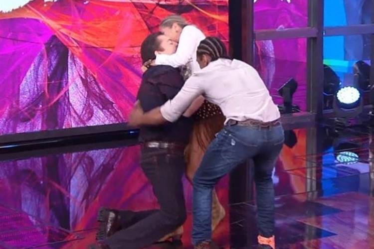 Adriane Galisteu derrubou Fausto Silva ao vivo no “Domingão do Faustão“, deste domingo (8)! Empolgada com as notas dos jurados no “Dança dos Famosos”, a artista saiu correndo em direção ao apresentador de 67 anos, pulou em cima dele e o deixou de joelhos no palco.