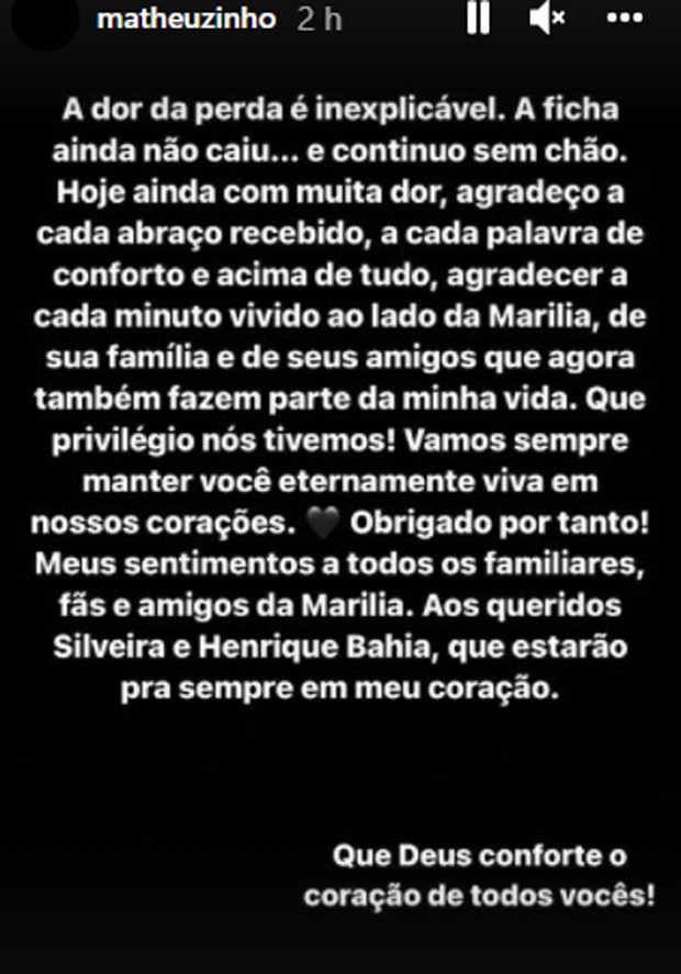“A dor da perda é inexplicável. A ficha ainda não caiu… E continuo sem chão. Hoje ainda com muita dor, agradeço cada abraço recebido, a cada palavra de conforto e acima de tudo, agradecer a cada minuto vivido ao lado da Marília, de sua família e de seus amigos que agora também fazem parte da minha vida”, escreveu nas redes sociais.