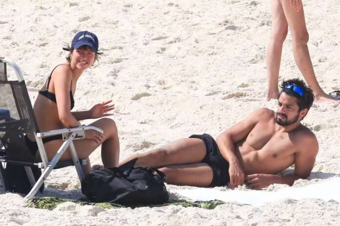 Depois do mergulho, os dois foram se deitar na areia e tomar um pouco de sol. Agatha estava com biquíni preto básico, e Rodrigo Simas usava uma bermuda na mesma cor.