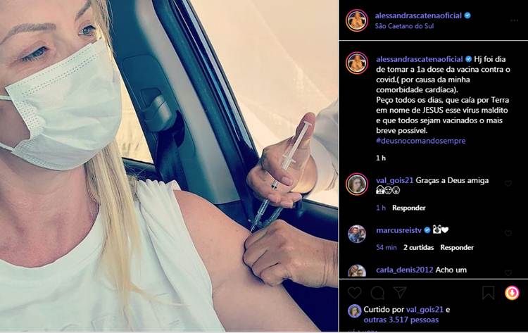 Ela publicou uma imagem do momento em que recebeu a vacina em seu perfil no Instagram. “Hoje foi dia de tomar a primeira dose da vacina contra a Covid-19 por causa da minha comorbidade cardíaca”, explicou.