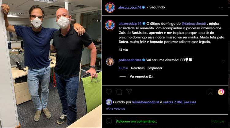 Escobar continuou. “Vim acompanhar o processo vitorioso dos Gols do Fantástico, aprender e me inspirar porque a partir do próximo domingo essa nobre missão vai ser minha. Muito feliz pelo Tadeu, muito feliz e honrado por levar adiante esse legado”, comemorou.