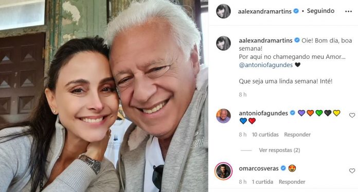 “Oie! Bom dia, boa semana! Por aqui no chamegando meu Amor… @antoniofagundes”, começou. “Que seja uma linda semana! Inté!”, desejou Alexandra.