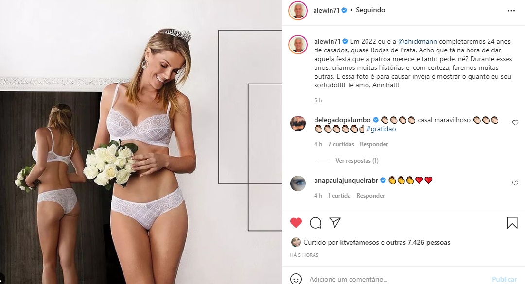 “Em 2022 eu e a Ana Hickmann completaremos 24 anos de casados, quase Bodas de Prata. Acho que está na hora de dar aquela festa que a patroa merece e tanto pede, né? Durante esses anos, criamos muitas histórias e, com certeza, faremos muitas outras. E essa foto é para causar inveja e mostrar o quanto eu sou sortudo! Te amo, Aninha!“, escreveu ele.