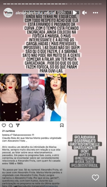 Dessa forma, sem papas na língua e por meio dos stories no Instagram, Alexandre Frota declarou: “Lamento muito que a Claudia Raia ainda não tenha me esquecido, com todo respeito, acho que ela está errando e passando da curva, com o tempo está ficando engraçada, ainda colocou na fofoca a Marisa [Monte]”, iniciou o deputado, que ainda detonou a postura das apresentadoras da atração, Astrid Fontenelle e Sabrina Sato, por rirem da ‘fofoca’.