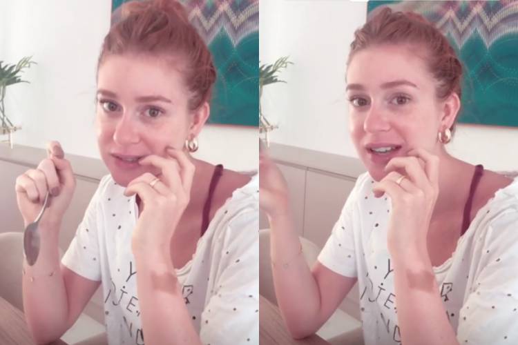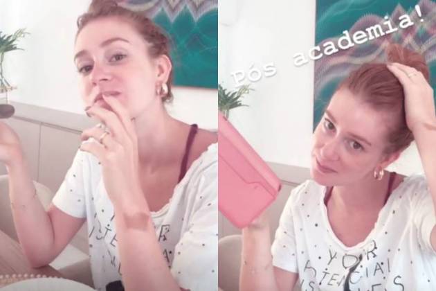 Através da função Stories do Instagram ele mostrou a atriz sem maquiagem após o treino na academia. Além disso, no registro Marina aparece com um look bem despojado e comendo um mamão.