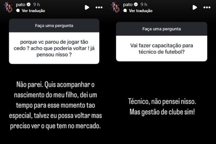 Na sequência das perguntas, Pato foi questionado se pretendia seguir a carreira de treinador de futebol e, direto, afirmou nos stories do Instagram: “Técnico, não pensei nisso. Mas, gestão de clube sim“, declarou o jogador de 35 anos.
