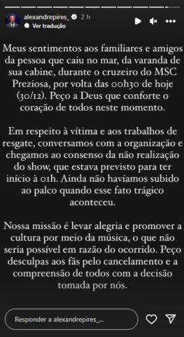 Dando sequência a sua linha de pensamento, Alexandre comentou que em respeito à pessoa que veio a óbito, optou por cancelar sua apresentação no cruzeiro que estava prevista para acontecer nesta noite. Além disso, Pires conta que não havia entrado no palco quando o triste fato ocorreu.