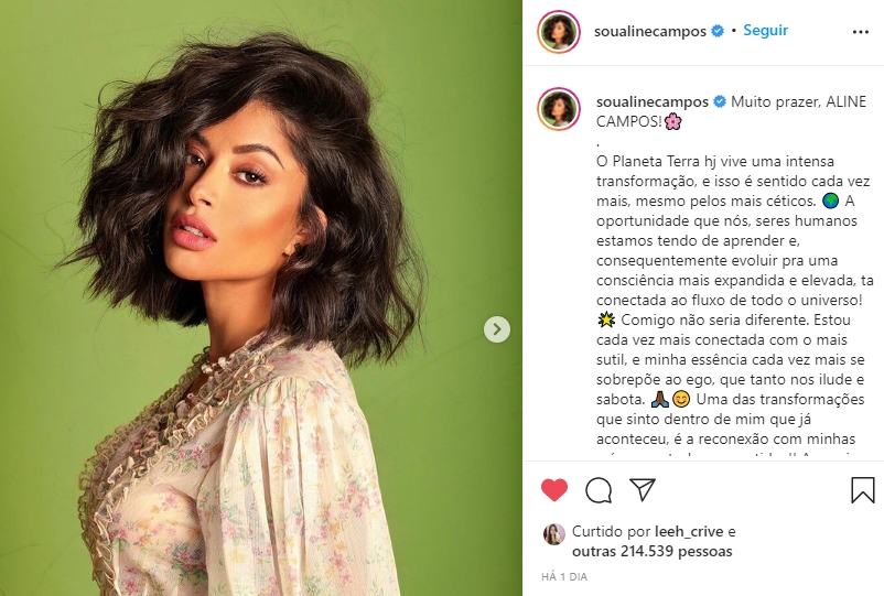 A partir de agora, a morena decidiu que seu nome será Aline Campos, que é o nome de batismo, do qual ela faz questão que a chamem daqui por diante. Com um longe texto Aline explicou o porque de sua decisão e falou sobre mudanças.