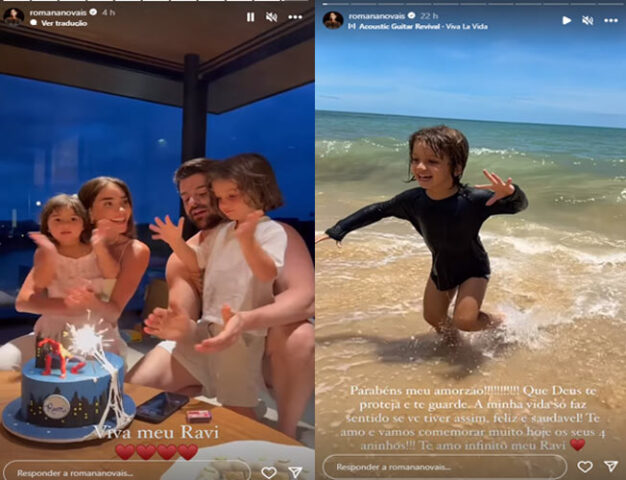 “Parabéns, meu amorzão! Que Deus te proteja e te guarde. A minha vida só faz sentido se você estiver assim, feliz e saudável! Te amo e vamos comemorar muito hoje os seus 4 aninhos! Te amo infinito, meu Ravi”, disse. O casal também são pais de Raika, de 3 anos.