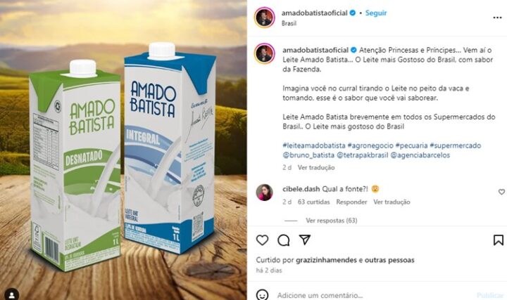 Por meio do feed no Instagram, Amado revelou que se tornou dono de uma marca de leite que leva seu nome, ‘Leite Amado Batista’. “Atenção Princesas e Príncipes… Vem aí o Leite Amado Batista… O Leite mais Gostoso do Brasil, com sabor da Fazenda. Imagina você no curral tirando o Leite no peito da vaca e tomando, esse é o sabor que você vai saborear. Leite Amado Batista brevemente em todos os Supermercados do Brasil.. O Leite mais gostoso do Brasil“, escreveu ele, ao anunciar a mega novidade.