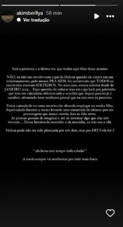 E encerrou: “Helena pode não ter sido planejada por nós dois, mas para DEUS ela foi. ‘Ela ficou esse tempo todo calada?’ A corda sempre vai arrebentar para o lado mais fraco“, escreveu Kimberlly.