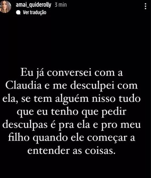Dessa forma, por meio de uma publicação no seu Instagram, Maiára Quiderolly revelou que entrou em contato com Claudia Silva e lhe pediu desculpas. “Eu já conversei com a Claudia e me desculpei com ela, se tem alguém nisso tudo que eu tenho que pedir desculpas é para ela e pro meu filho quando ele começar a entender as coisas”, disse ela, em seu perfil oficial.