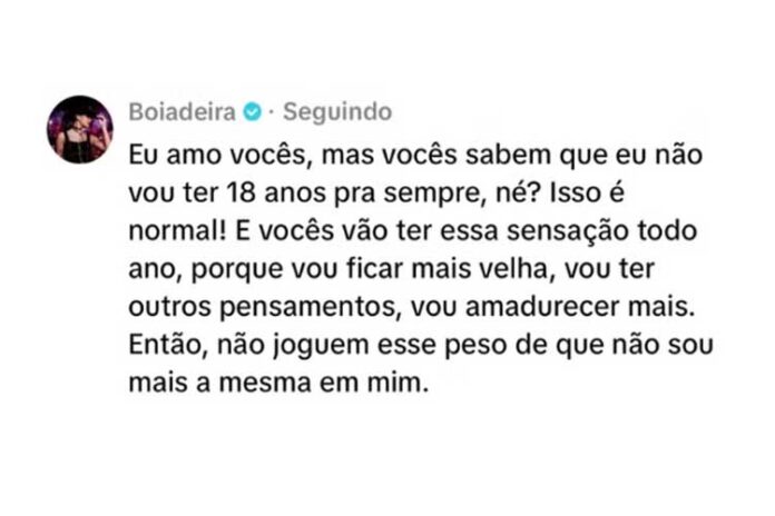 “Eu amo vocês, mas vocês sabem que eu não vou ter 18 anos pra sempre, né? Isso é normal! E vocês vão ter essa sensação todo ano, porque vou ficar mais velha, vou ter outros pensamentos, vou amadurecer mais. Então, não joguem esse peso de que não sou mais a mesma em mim”, desabafou.