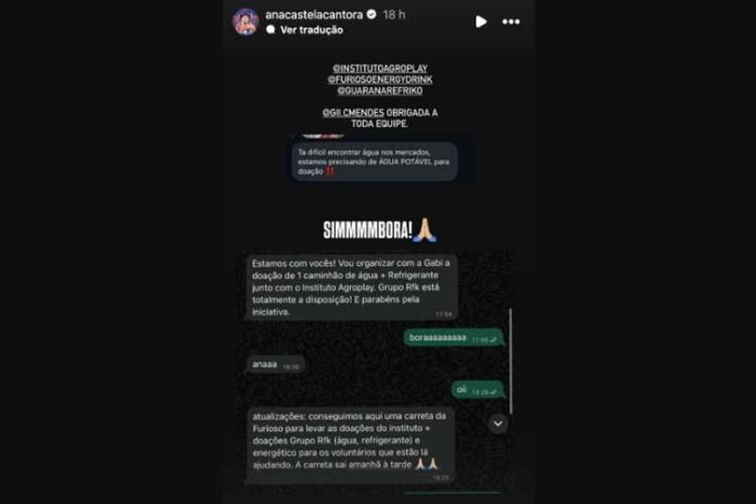 “Estou aqui para pedir a ajuda de vocês para um estado que sempre me recebeu com muito amor e muito carinho, que é Minas Gerais. Eu vou deixar aqui o pix do Instituto Agroplay para caso você sentir no coração o valor que você quiser doar”, destacou Castela em seu Stories.