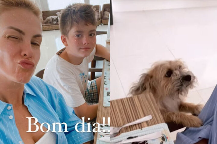 Aproveitando a companhia para tomar o café da manhã, Hickmann falou sobre a felicidade de estar ao lado do herdeiro. “Bom dia!”, disse ela, mostrando também Joaquim, o cachorrinho responsável por salvá-la durante a agressão de seu ex-marido. “Fala bom dia, Joaquim! Estamos todos aqui no café da manhã, o Alezinho ainda está dormindo um pouco, está um pouco sonolento”, destacou.