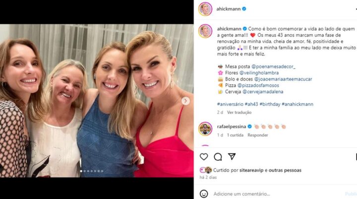 Além de Alezinho, Ana também celebrou mais um ano de vida nesta semana. Há dois dias, ela compartilhou cliques de sua celebração nas redes, reagindo: “Como é bom comemorar a vida ao lado de quem a gente ama!!! Os meus 43 anos marcam uma fase de renovação na minha vida, cheia de amor, fé, positividade e gratidão!!! E ter a minha família ao meu lado me deixa muito mais forte e mais feliz“, declarou ela, compartilhando cliques com seus familiares.