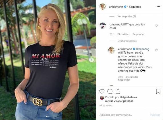 Ana Hickmann postou em suas redes sociais uma foto divulgando sua linha de produtos, e nos comentários, além de receber vários elogios, ela encontrou uma mensagem em espanhol e por um equívoco achou que a pessoa não havia gostado da publicação e respondeu.