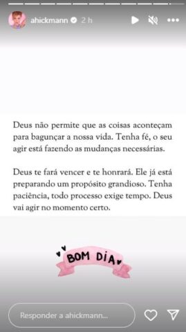 Dessa forma, após ter o seu pedido negado por um juiz de São Paulo, Ana Hickmann compartilhou nos stories do Instagram: “Deus não permite que as coisas aconteçam para bagunçar nossa vida. Tenha fé, o seu agir está fazendo as mudanças necessárias“, iniciou ela, que completou: “Deus te fará vencer e te honrará. Ele já está preparando um propósito grandioso. Tenha paciência, todo processo exige tempo. Deus vai agir no momento certo.”