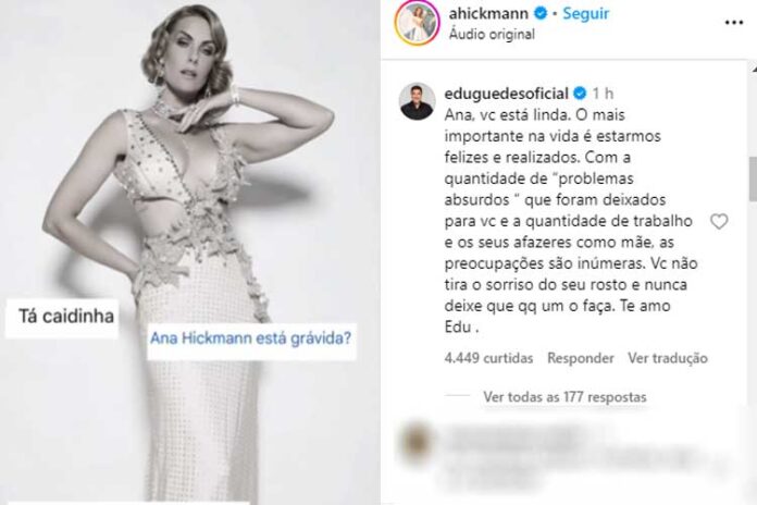 Nos comentários, ela recebeu o apoio de Edu Guedes. “Ana, você está linda. O mais importante na vida é estarmos felizes e realizados. Com a quantidade de ‘problemas absurdos’ que foram deixados para você e a quantidade de trabalho e os seus afazeres como mãe, as preocupações são inúmeras. Você não tira o sorriso do seu rosto e nunca deixe que qualquer um o faça. Te amo, Edu”, afirmou.