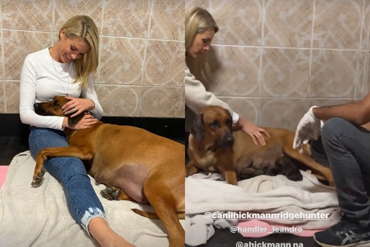 A apresentadora foi flagrada ajudando sua cadela Esmeralda, da raça rhodesian ridgeback, no parto. O marido da loira, Alexandre Correa, foi quem fez o registro filmando tudo e dando suporte emocional para que o pet desse à luz a filhotes.