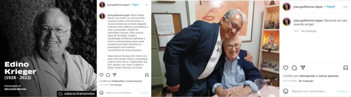 Quem resolveu fazer a última homenagem para Edino foi o compositor João Guilherme Ripper. Através de sua conta do Instagram ele destacou: ”Edino Krieger deixou-nos ontem, no início da noite chuvosa e triste no Rio de Janeiro. A música brasileira de concerto despede-se de seu maior defensor, que dedicou a vida à composição, direção de instituições culturais, crítica musical, ações de formação, criação e coordenação de festivais dedicados à música contemporânea, entre outras iniciativas que fazem de Edino um personagem monumental e incontornável da cultura brasileira.”