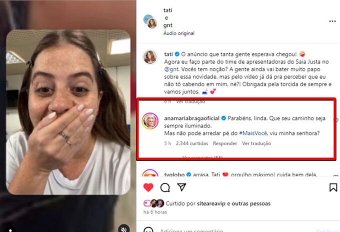 Além de Ana Maria, Patrícia Poeta também reagiu a novidade envolvendo a colega de TV Globo: “Arrasa muito, @tati“, desejou ela. “Arrasa, Tati, orgulho máximo! cuida bem dela, viu, @gnt?“, escreveu o perfil oficial da emissora aberta. “Parabéns parceiraaa!!! JÁ FALEI MIL VEZES SOU SEU FÃ!!! VOCÊ MERECE O MUNDO“, escreveu o amor da artista.