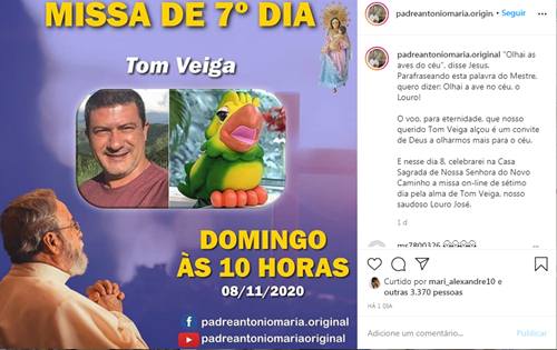No Instagram, o religioso convidou os internautas para participarem da cerimônia a partir das 10h. A postagem, realizada no sábado no perfil do religioso, ele fez uma homenagem ao intérprete do Louro José. “‘Olhai as aves do céu’, disse Jesus. Parafraseando esta palavra do mestre, quero dizer: ‘Olhai a ave no céu, o Louro’!?O voo, para eternidade, que nosso querido Tom Veiga alçou, é um convite de Deus a olharmos mais para o céu”, escreveu.
