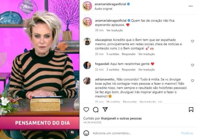 Dessa forma, por meio do Instagram, Ana Maria Braga compartilhou seu ‘Pensamento do Dia’, realizado no ‘Mais Você’ de hoje. “Diz que o bem, gente, se faz em silêncio, o resto é teatro“, disparou ela. “Quem faz de coração não fica esperando aplausos“, completou a apresentadora, na legenda da postagem.