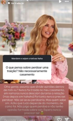Na caixinha de perguntas dos stories do Instagram, Ana Paula Siebert recebeu o seguinte questionamento: “O que pensa sobre perdoar uma traição? Não necessariamente casamento“, quis saber a internauta. “Olha gente, assunto que divide opiniões dentro de mim, viu? Nunca fui traída no meu casamento, em namoros nunca descobri durante a relação (mas depois sim hahaha). Portanto, nunca precisei perdoar”, declarou.