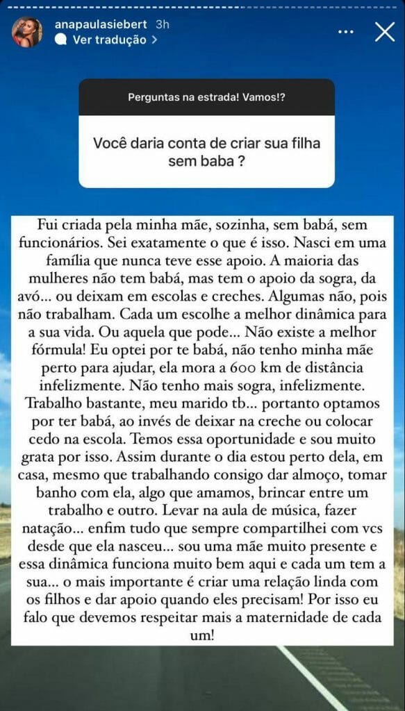 Dessa forma, por meio do Instagram, Ana Paula Siebert, decidiu colocar um ponto final na polêmica em que se envolveu recentemente. Através dos stories, a influenciadora digital foi questionada por um internauta se conseguiria cuidar da filha primogênita sem ajuda da funcionária.