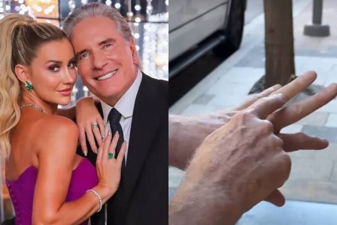 Ana Paula Siebert ainda aproveita o momento para alfinetar o marido, que está em seu quinto casamento. “O cofre lá em casa é lotado [de alianças], porque já teve muitas [esposas]. Pega uma lá“, diz ela. “Posso pegar uma das antigas? Escrita o nome da ex-mulher?“, provoca ele. “A gente leva no lugar pra polir. Melhor do que comprar uma nova“, concorda Ana Paula. “Então, fechou“, responde o empresário.