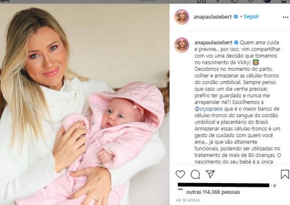 “Quem ama cuida e previne… por isso, vim compartilhar com vcs uma decisão que tomamos no nascimento da Vicky! Decidimos no momento do parto, colher e armazenar as células-tronco do cordão umbilical. Sempre penso que caso um dia venha precisar, prefiro ter guardado e nunca me arrepender né?!”, contou ela.
