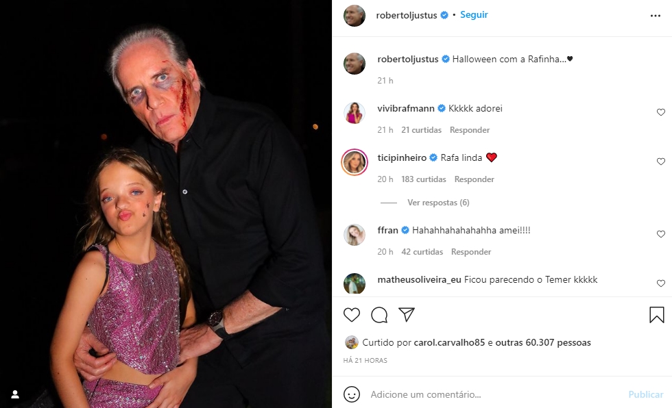 Roberto Justus também compartilhou um clique curtindo a data e aproveitou para surgir ao lado da filha Rafa Justus, de 10 anos. O empresário publicou em seu feed de notícias um clique onde exibiu a herdeira, filha de seu ex relacionamento com Ticiane Pinheiro, também caracterizada de bruxinha.