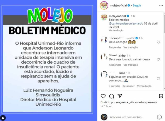 “O Hospital Unimed-Rio informa que Anderson Leonardo encontra-se internado em unidade de terapia intensiva em decorrência de quadro de insuficiência renal. O paciente está acordado, lúcido e respirando sem a ajuda de aparelhos”, diz o texto.