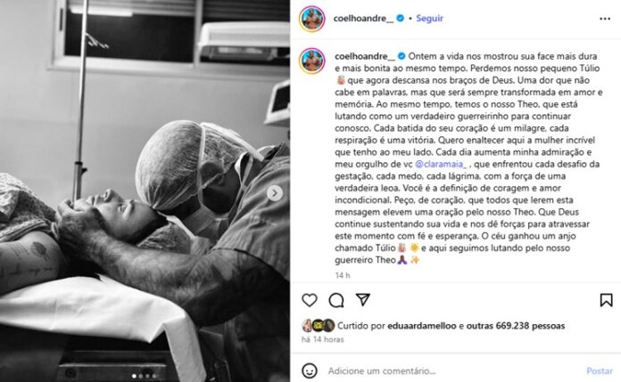 A confirmação do óbito veio por meio das redes sociais, onde André Coelho compartilhou cliques do parto, lamentando a partida de Túlio: “Ontem a vida nos mostrou sua face mais dura e mais bonita ao mesmo tempo. Perdemos nosso pequeno Túlio, que agora descansa nos braços de Deus. Uma dor que não cabe em palavras, mas que será sempre transformada em amor e memória. Ao mesmo tempo, temos o nosso Theo, que está lutando como um verdadeiro guerreirinho para continuar conosco. Cada batida do seu coração é um milagre, cada respiração é uma vitória”, escreveu.