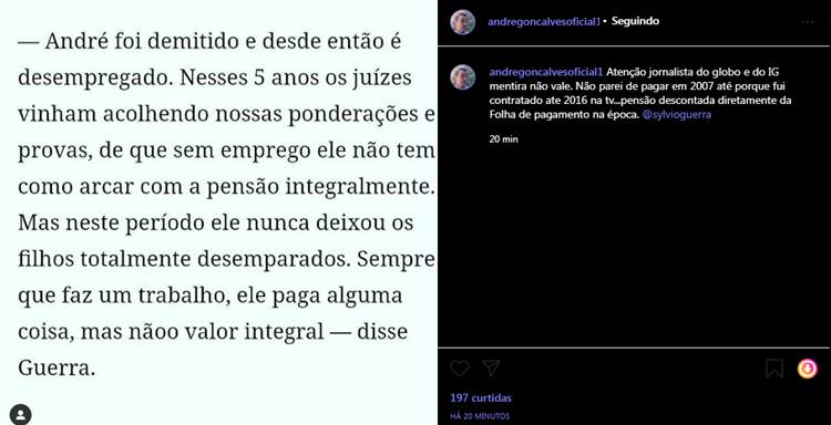 Em um post, ele desmentiu algumas informações publicadas. “Atenção jornalista do globo e do IG mentira não vale. Não parei de pagar em 2007 até porque fui contratado ate 2016 na tv…pensão descontada diretamente da Folha de pagamento na época”, escreveu, marcando o advogado Sylvio Guerra na legenda.
