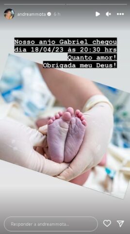 Em sua conta oficial do Instagram Stories, a mulher falou um pouco mais sobre este momento mágico da vida. Ao compartilhar uma imagem dos pezinhos do bebê, ela escreveu o seguinte: ”Nosso anjo Gabriel chegou dia 18/04/2023 às 20:30 hrs. Quanto amor! Obrigada meu Deus”.