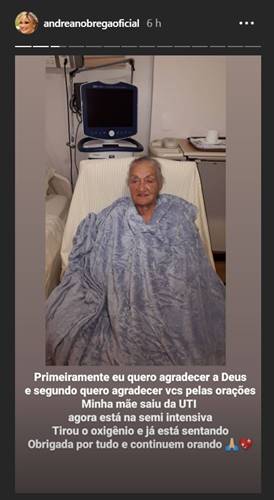 Andréa apagou a última publicação, dizendo que era uma foto muito triste e a equipe do Área VIP, mesmo tendo essa imagem, vai preservar e continuar torcendo e orando para que a mãe da ex do apresentador Carlos Alberto de Nóbrega saia dessa o quanto antes.