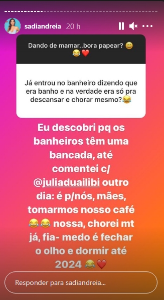 Em resposta, ela brincou: “Eu descobri porque os banheiros têm uma bancada: é para nós, mães, tomarmos nosso café. Nossa, chorei muito já. Medo é fechar o olho e dormir até 2024″.