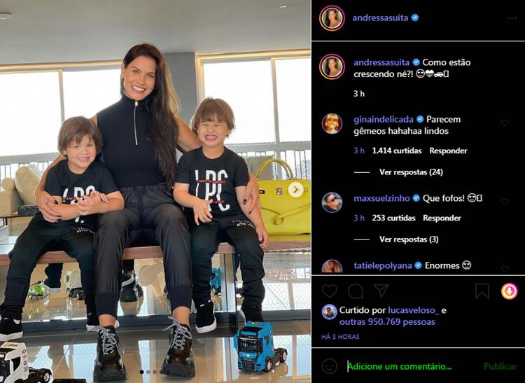 A mamãe coruja comentou no post sobre o crescimento rápido dos filhos. “Como estão crescendo né?!”, mostrou os garotos usando a mesma roupa e combinando o look com a modelo.