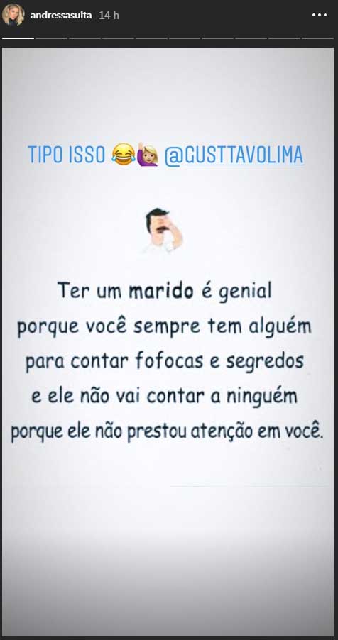 Não é fácil ficar tanto tempo longe da pessoa que tanto ama. Neste domingo (4), Andressa compartilhou em seu Stories no Instagram uma mensagem enviando uma pequena indireta para o marido.