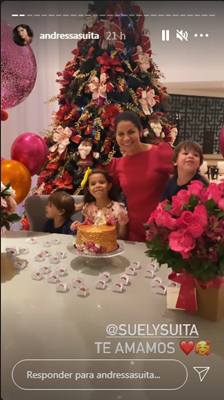 Andressa fez questão de compartilhar alguns momentos da celebração com seus seguidores. Ela postou um vídeo no stories do Instagram onde os filhos, Gabriel e Samuel, cantam os parabéns ao lado da avó e sopram a velinha.