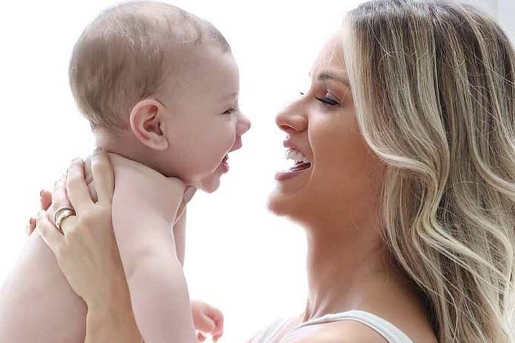 Na imagem, a modelo aparece de branco, esbanjando felicidade ao carregar o herdeiro pelos braços e na legenda, ela derreteu-se: “Metade de mim é amor… E a outra metade tb…”, escreveu a loira.