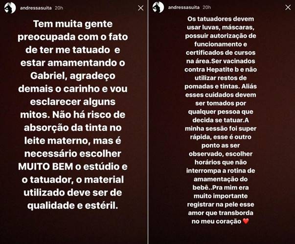 “Tem muita gente preocupada com o fato de ter me tatuado e estar amamentando o Gabriel. Agradeço demais o carinho e vou esclarecer alguns mitos. Não há risco de absorção da tinta no leite materno, mas é necessário escolher muito bem o estúdio, o tatuador, o material utilizado deve ser de qualidade e estéril”, escreveu ela em mensagem publicada no Insta Stories, nesta quinta- feira (17).