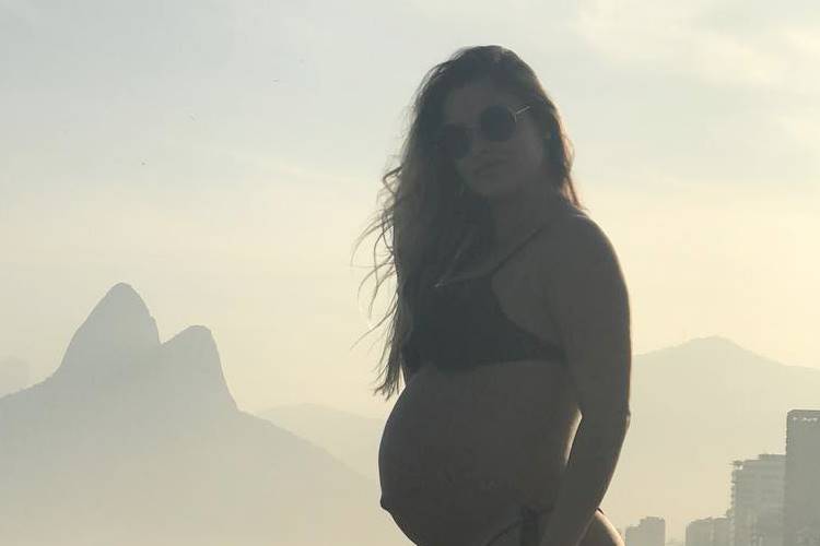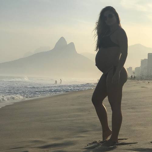 Na imagem, a mulher de Gusttavo Lima aparece de biquíni, exibindo o barrigão em uma praia do Rio de Janeiro.