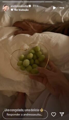 Através dos stories no Instagram, Andressa Suita compartilhou um clique íntimo, mostrando que estava curtindo uma bela noite na cama com seu querido marido. Ainda na imagem divulgada, ela mostra que o casal estava se saboreando com nada mais e nada menos do que uvas verdes. “Uva congelada, uma delícia“, ainda escreveu ela, na legenda.