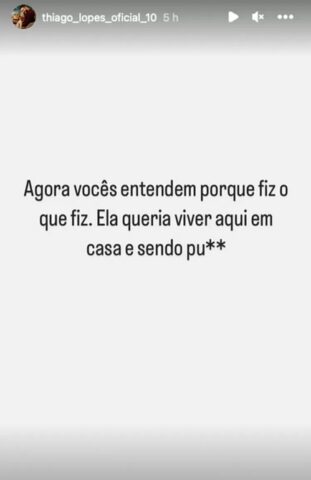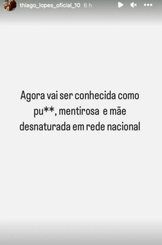 Thiago Lopes, por sua vez, ficou enfurecido com as declarações concedidas por Andressa Urach na entrevista que concedeu para Luciana Gimenez. Por meio dos stories de seu perfil pessoal no Instagram, o ex-marido compartilhou supostos prints de conversas entre a modelo e possíveis clientes – que teriam ocorrido quando ainda eram casados – afirmando que a influenciadora digital jamais se viu longe da vida como garota de programa.