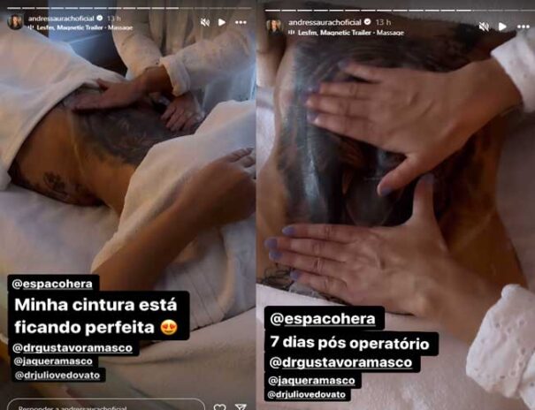 Desta vez, a modelo deu um gostinho de como ficou sua cintura após o procedimento. Andressa realiza uma massagem para reduzir o inchaço. “Minha cintura está ficando perfeita!”, contou ela na legenda.